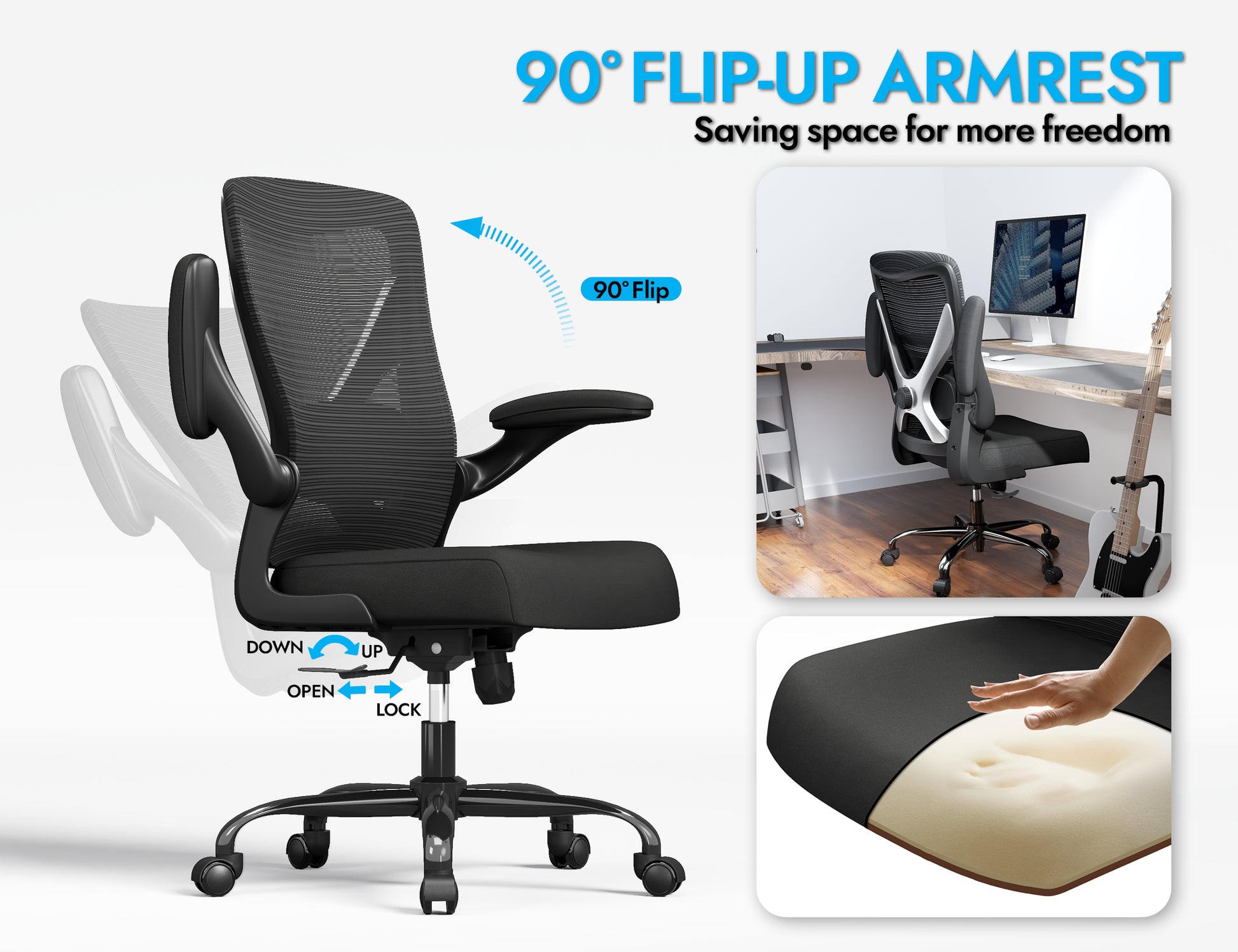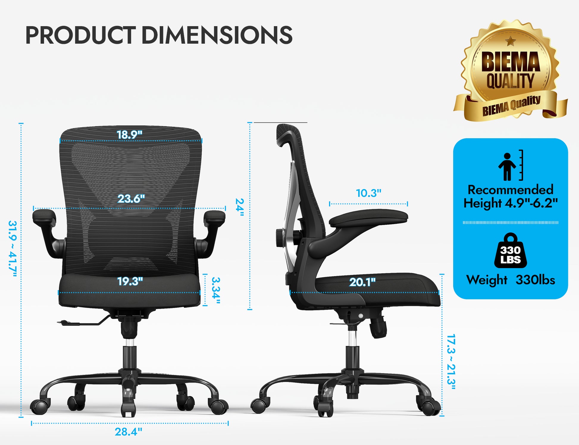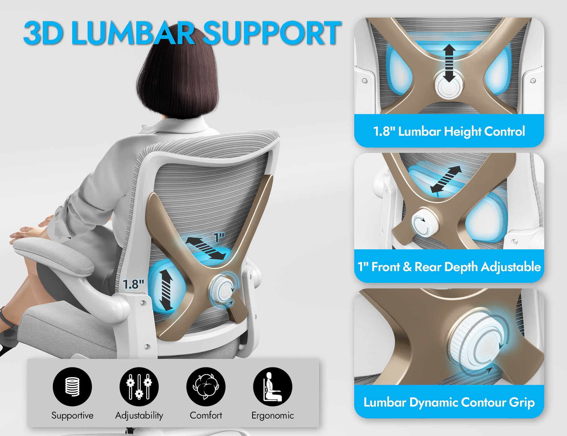 - Ergonomic Office Chair: Experience unparalleled support with our ergonomic office chair, designed to provide comprehensive assistance for your back, hips, and arms. Tailored lumbar support ensures your comfort and well-being. Suitable for people of about 5'5" to 6'2". Easily adjust seat height, backrest, and flip-up arms to cater to diverse needs, offering comfortable support during extended periods of sitting