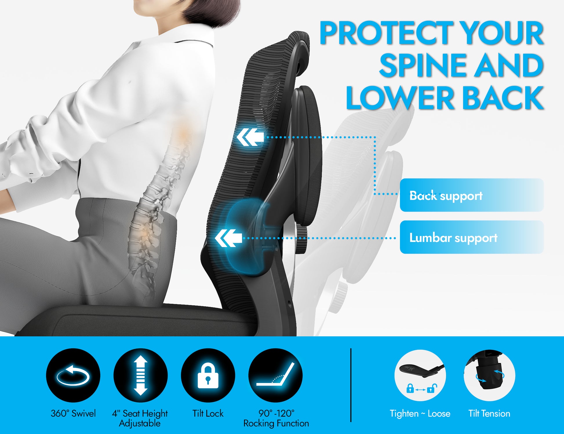 - Comfortable Breathable Mesh Seat: This office chair offers a spacious seating area, accommodating various body types. Overall dimensions (including arms): 25.7" W x 17.3" D x 46.9.3"-49.2" H, Seat dimensions: 20" W x 17.3" D x 18.5"-3" H. It can support up to 330 lbs. Its unique recline function allows you to tilt the backrest (90~120°) or sit upright freely, ensuring your comfort and relaxation