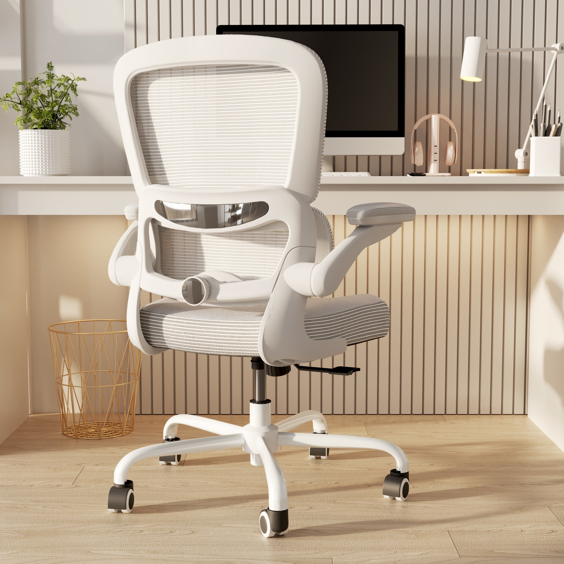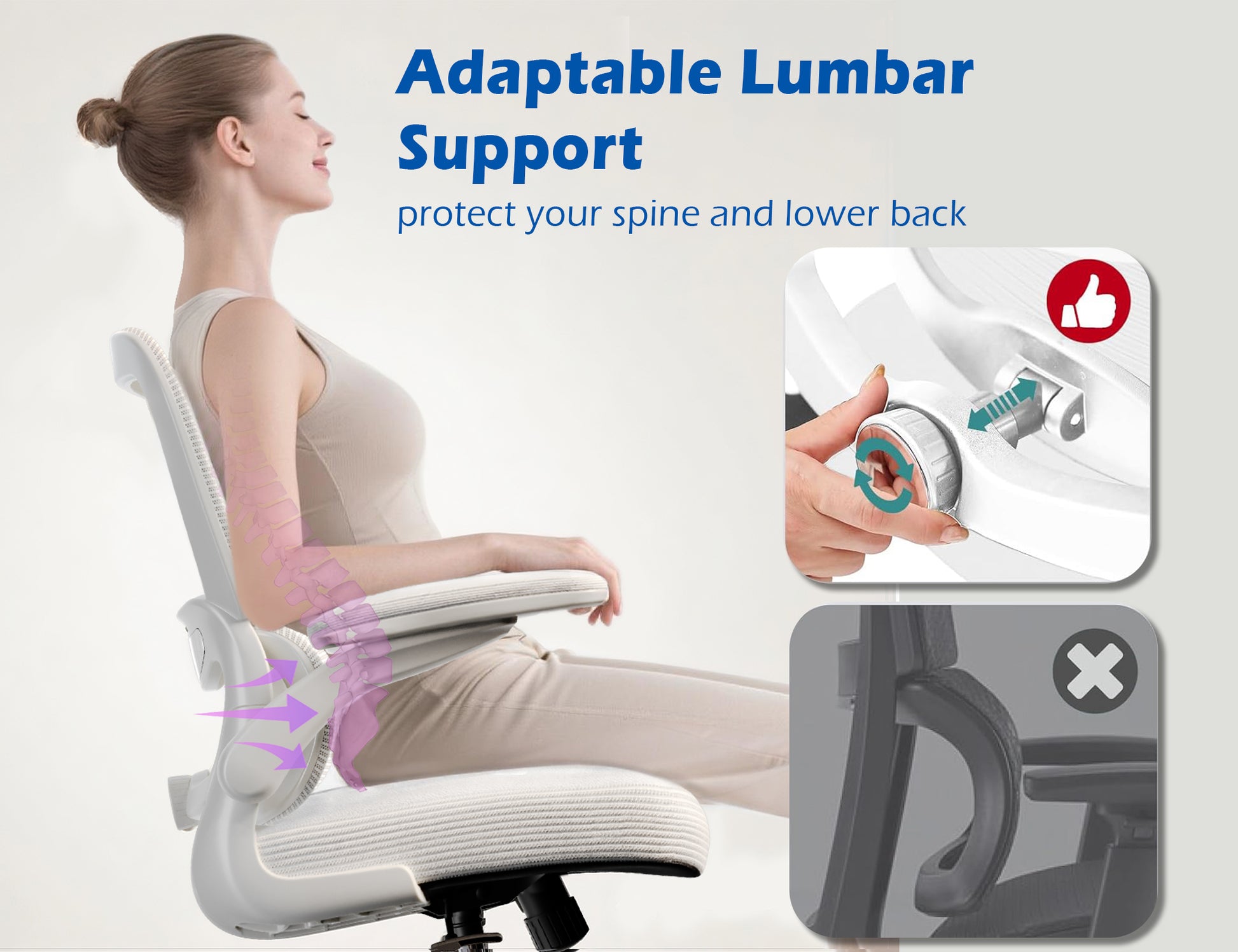 - ERGONOMIC SUPPORT: TRALT ergonomic office chair for back pain relief is a desk chair comfy enough for long hours, featuring adjustable lumbar support to promote natural posture. A wider seat (20" W x 17.3" D x 18.5"-21.3" H) helps distribute weight evenly, suitable for people of about 5'5" to 6'2". Flip-up armrests make it a comfy chair for small spaces